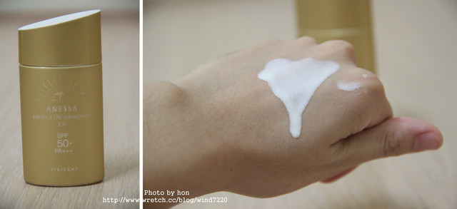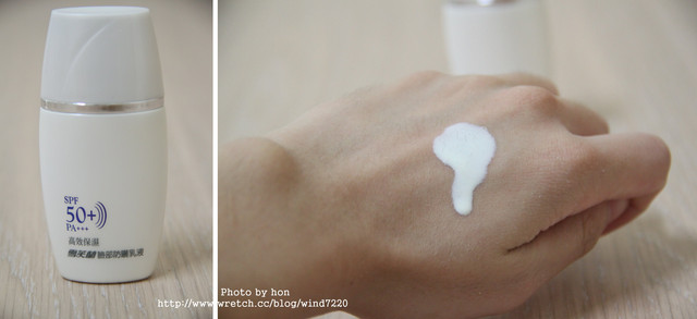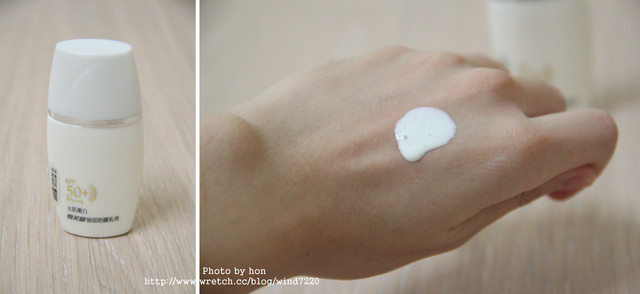 擠出呈現"白色液體狀"很好推開 但用量要拿捏好 擦太多會有點油跟泛白用量很省 香味有點過香 重點是它不會長痘痘跟粉刺這點讓我非常喜歡((我很容易因為防曬而長痘痘))